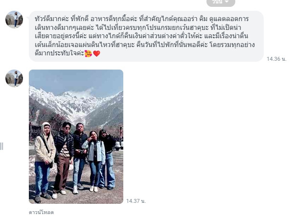 ทัวร์ดีมากค่ะ ที่พักดี อาหารดีทุกมื้อค่ะ ที่สำคัญไกด์ ดูแลตลอดการเดินทางดีมากๆเลยค่ะ ได้ไปเที่ยวครบทุกโปรแกรมยกเว้นฮาคุบะ ที่ไม่เปิดน่าเสียดายอยู่ตรงนี้ค่ะ แต่ทางไกด์ก็คืนเงินค่าส่วนต่างค่าตั๋วให้ค่ะ โดยรวมทุกอย่างดีมากประทับใจค่ะ