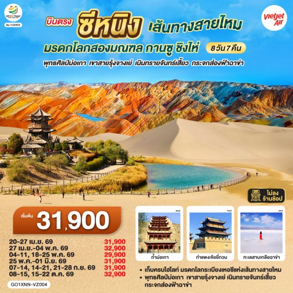 จงฉวน - วัดพระใหญ่จางเย่ - เมืองจางเย่ – ตลาดกลางคืนห มิงชิง - ภูเขาสายรุ้งจางเย่ (รวมค่าบัตรเข้า + รถอุทยาน) – ด่านเจียยวี่กวน กำแพงเมืองจีน (รวมค่า บัตรเข้า + รถอุทยาน + ค่าขึ้นกำแพงเมือง) – หอสัญญาณไฟด่านแรกของกำแพงเมืองจีน – เจียยวี่กวน – ถนนคนดินต้าถัง - ประติมากรรมทารกแห่งแผ่นดิน – ประติมากรรมพระพักตร์แห่งจักรพรรดิฮั่นอู่ตี้ ทะเลทรายหมิงซาซาน และ สระน้ำพระจันทร์เสี้ยว (รวมค่าบัตรเข้า) – ตุนหวง – ตลาด กลางคืนซาโจว - ถ้ำมั่วเกา (รวมค่าบัตรเข้า + รถอุทยาน) – เก๋อเอ่อร์มู่ – เมืองจำลองวัฒนธรรมคุนหลุน - ทะเลสาบเกลือชาร์ฮาน (รวมค่าบัตรเข้า + รถอุทยาน) – ฉาข่า – ตลาดกลางคืนฉาข่า