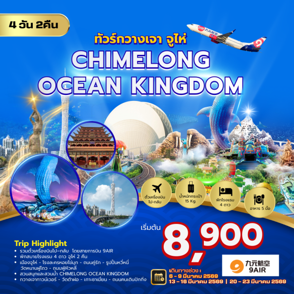 วัดต้าฝอ – ถนนคนเดินเป่ยจิงลู่ – Canton tower (ถ่ายรูปด้านนอก) - เมืองจูไห่ - โรงละครหอยไข่มุก - Chimelong Ocean Kingdom ( เต็มวัน ) รวมรถรับ+ส่ง - ร้านยาสมุนไพร – จูไห่ ฟิชเชอร์เกิร์ล - พิพิธภัณฑ์หยก – ตลาดใต้ดินก๋งเป่ย - เมืองกวางโจว