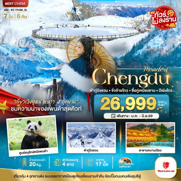 • ทัวร์เฉิงตู “สวิตเซอร์แลนด์แดนมังกร” เฉิงตู ต๋ากู่ปิงชวน สี่ดรุณี จิ่วจ้ายโกว