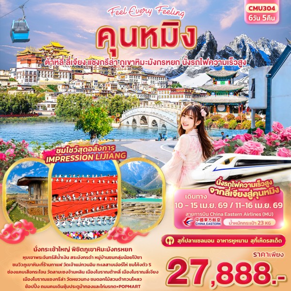 นั่งรถไฟความเร็วสูงต้าหลี่-วัดเจ้าแม่กวนอิม-ผ่านชมเจดีย์สามองค์-เมืองโบราณต้าหลี่-เมืองโบราณแขงกรีล่า - วัดชงจ้านหลิน-ช่องเสือกระโจม-เมืองโบราณลี่เจียง-บัวหิมะ - อุทยานภูเขาหิมะมังกรหยก(รวมกระเช้าไปกลับ)-ชมแสดงความประทับใจแห่งลี่เจี่ยง-ทะเลสาปไป๋สุยเหอ-ร้านกาแฟ Yun Di An(ไม่รวมเครื่องดื่ม)-เดินทางชูฉง