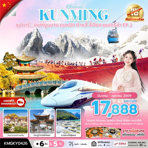 • ทัวร์คุณหมิง ซุปตาร์...เสน่ห์ยูนนาน คุนหมิง ต้าหลี่ ลี่เจียง แชงกรีล่า ทัวร์ไม่ลงร้าน นั่งรถไฟความเร็วสูง