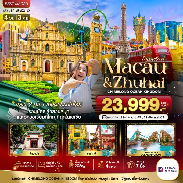 เมืองกวางเจา – จัตุรัสฮัวเฉิง – แคนตันทาวเวอร์ (ด้านนอก) - มาเก๊า – เดอะ ปารีเซียน – เดอะ ลอนดอนเนอร์ - เวเนเชี่ยน (บริการรถรับ - ส่ง) – ข้ามด่านกลับเมืองจูไห่ - ถ่ายรูปโรงละครหอยไข่มุก – ร้านหยก - สวนสนุกฉางหลง Chimelong Ocean Kingdom (ชมการแสดงพลุ) - ร้านผ้าไหม - ร้านบัวหิมะ - จูไห่ฟิชเชอร์เกิร์ล - ถนนคนเดินฟู่หัวหลี่ – วัดต้าฝอ – ถนนคนเดินเป่ยจิงลู่ + POP MART