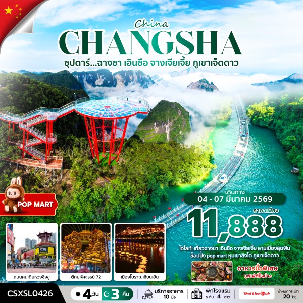 เมืองฉางซา • ถนนคนเดินหวงซิงลู่ • ร้านขนม BUSY FOR YOU • ร้านชานม SEXY TEA • ตึก IFS • เมืองฉางเต๋อ - เมืองเฟิงหวง • เมืองโบราณเฟิงหวง • ล่องเรือแม่น้ำถัวเจียง • สวนหมีแพนด้า • ชมบรรยากาศเมืองโบราณเฟิ่งหวงยามค่ำคืน - เมืองฟูหรงเจิ้น • เมืองโบราณฟูหรงเจิ้น • ถนนคนเดิน Wuli Slate Street • ทางเดินทะลุน้ำตกฟูหรง • ชมวิวกลางคืนเมืองโบราณฟูหรงเจิ้น - เมืองจางเจียเจี้ย • ร้านยา • ภูเขาเจ็ดดาว (รวมค่ากระเช้าและรถแบตเตอรี่) • จุดชมวิวพื้นกระจก 1520 | เลือกซื้อออฟชั่นเสริม: โชว์จิ้งจอกขาว / โชว์รักพันปี -