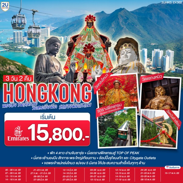 ฮ่องกง – แถมวัดชีซาน – เจ้าแม่กวนอิมรีพลัสเบย์ – จุดชมวิว - วัดหลินฟากง - ช้อปปิ้งเลดี้มาเก็ต - นั่งกระเช้านองปิงไหว้พระใหญ่เกาะลันเตา - ช้อปปิ้งซิติเกทเอ้าท์เลต - วัดเจ้าแม่ทับทิมทินหัว - เจ้าแม่กวนอิมฮงฮำ - ศูนย์ฮวงจุ้ย - ร้านหยก - วัดแชกงหมิว – วัดหวังต้าเซียน - ช้อปปิ้งจิมซาจุ่ย