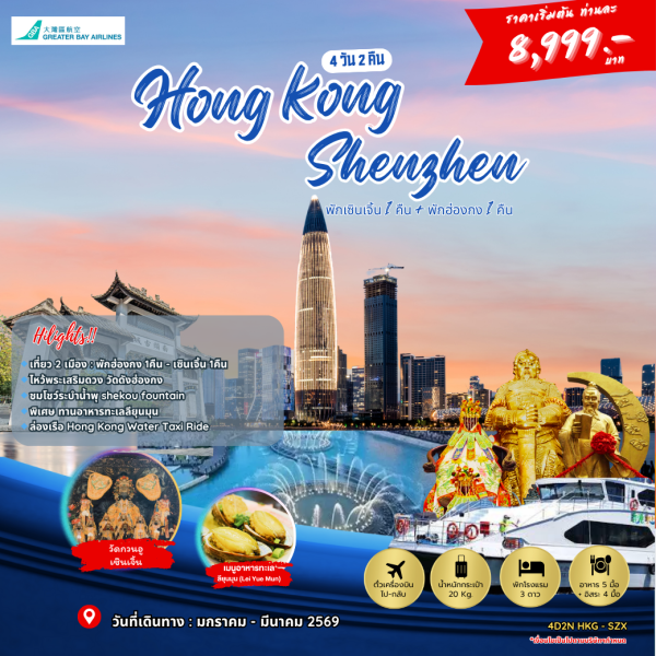 เมืองฮ่องกง - เซินเจิ้น OCT Bay - ตึกผิงอัน -ช้อปปิ้งที่ COCO Park - วัดกวนอู - ยาบัวหิมะ - เมืองเก่าหนานโถว - เมืองจำลองฮอลแลนด์ - ร้านหยก - ตลาดตงเหมิน - ฮ่องกง - วัดแชกงหมิว - โรงงานจิวเวอร์รี่ - วัดหวังต้าเซียน - วัดแม่กวนอิมฮ่องฮำ - ช้อปปิ้งจิมซาจุ่ย