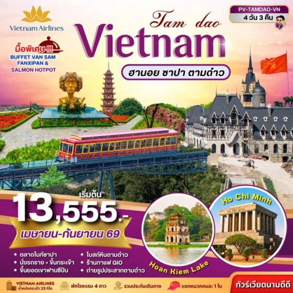ซาปา – ตลาดไนท์ซาปา - นั่งรถราง+ขึ้นกระเช้า สู่ยอดเขาฟานซีปัน • Moana Sapa Café • หมู่บ้านก๊าดก๊าด • โบสถ์หิน - ถ่ายรูปชายแดนจีน เวียดนาม • ร้านเยื่อไผ่ • วัดเฉินก๊วก - สุสานลุงโฮ • Mega Grand World • ทะเลสาบคืนดาบ • ถนน 36 สาย • ร้าน OTOP