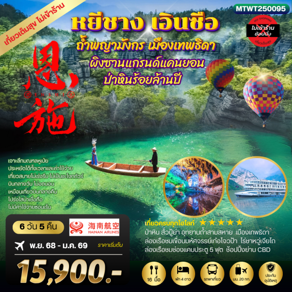หมู่บ้านชนเผ่าต้ง – อุทยานซือจื่อกวน (สะพานลอยน้ำ) – เมืองเทพธิดาชาวถู่เจีย - อุทยานหุบเขาผิงซาน – ล่องเรือผิงซานแกรนด์แคนยอน – ริมแม่น้ำเซียนซานก้งสุ่ย - ชมวิวกลางคืนเมืองเสวียนเอิน - อุทยานภูเขาจินหลีซาน – ร่วมงานเลี้ยงรอบกองไฟ - ช้อปปิ้งร้านของพื้นเมืองเอินซือ - ถ้ำเถิงหลง – ชมโชว์ Ripples of the Qing River - ศูนย์การค้าเหอหรุนซิตี้