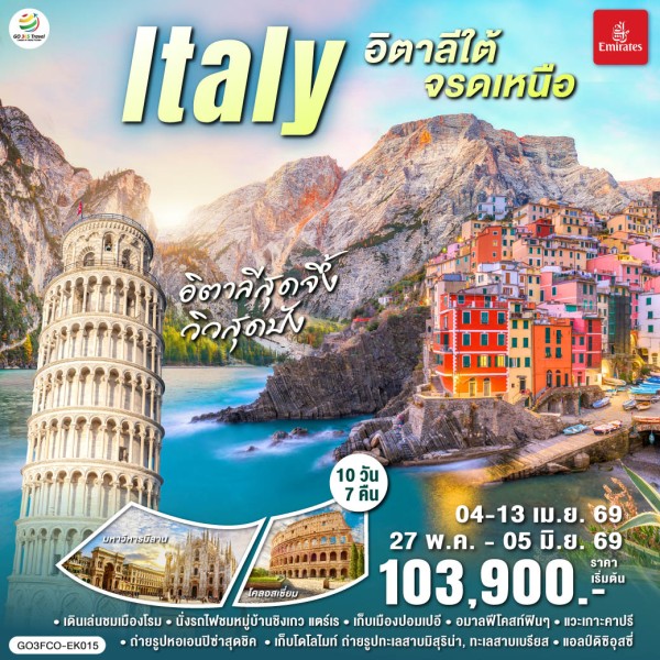 มิลาน - Serravalle outlet - เบรสชา - ออร์ทิเซ่- ขึ้นกระเช้าสู่แอลป์ ดิ ซุสเซ่ – ถ่ายรูปทะเลสาบเบรียส - ทะเลสาบมิสุริน่า – โบลซาโน - นั่งเรือเข้าสู่เกาะเวนิส –ชมสะพานถอนหายใจ - ถ่ายรูปบริเวณจัตุรัสซานมาร์โค - เวนิส เมสเตร้ - ฟลอเร้นซ์ - มหาวิหารซานตา มาเรีย เดล ฟิโอเร - จัตุรัสเดลลาซิญญอเรีย - ปิซ่า - จัตุรัสกัมโป เดย์ มีราโกลี - ถ่ายรูปกับหอเอนปิซ่า - ลา สเปเซีย – นั่งรถไฟสู่หมู่บ้านชิงเกว แตร์เร - หมู่บ้านริโอแมกจิโอเร่ - หมู่บ้านมานาโรล่า - หมู่บ้านแวร์นาซซา - โรม - โรม – วาติกัน – โคลอสเซี่ยม - น้ำพุเทรวี่ - ย่านบันไดสเปน
