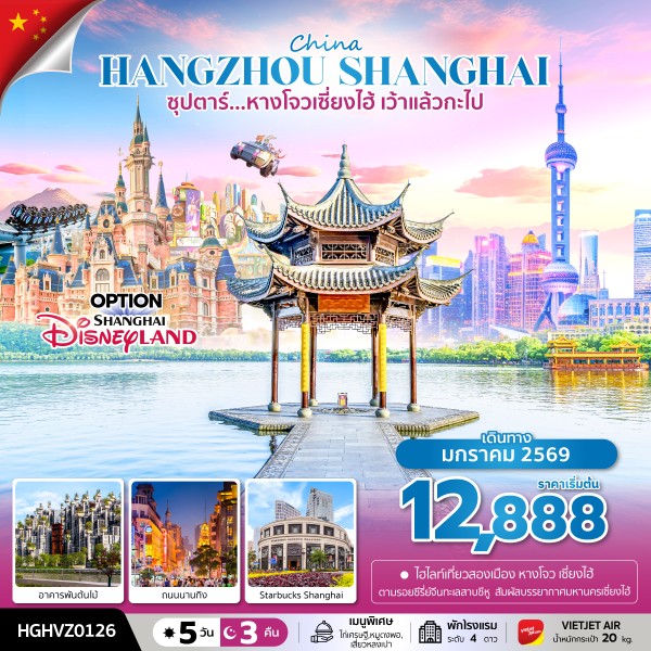 วัดจิ้งฉือ – ชมทะเลสาบซีหู – สวนใบชาหลงจิ่ง – ถนนโบราณเหอฝางเจีย – เมืองเซี่ยงไฮ้ – หาดไว่ทาน หรือ หาดเจ้าพ่อเซี่ยงไฮ้ – ถนนนานกิง – POP MART - อิสระเต็มวัน หรือ เลือกซื้อ Option เสริม – สวนสนุก Shanghai Disneyland (ไม่รวมรถรับ-ส่ง) – CITY TOUR SHANGHAI - เทียนอันเชียนซู่ – ตลาดร้อยปีเฉินหวังเมี่ยว – ร้านหยก – หอไข่มุก(ด้านนอก) – ร้านบัวหิมะ – ฟรอเลนเทีย วิลเลจ