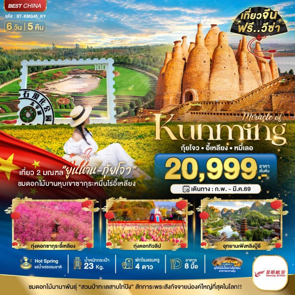 คุนหมิง - อี้เหรียญ (Yiliang) - สวนดอกซากุระ - ลู่ผิง (Luoping) - ทุ่งดอกมัสตาร์ด (รวมแบตเตอรี่) - คุนหมิง - หลูซี (Luxi) - หมู่บ้านโบราณเฉิงจื่อ - ถ้ำอลูโบราณ - หมีเล่อ (Mile) ย้อนรอยอารายธรรมโบราณ สู่ความลี้ลับใต้พิภพ - หมีเล่อ - ศูนย์ศิลปะเฟิงหยุน (รวมรถแบตเตอรี่) - อุทยานไท่ผิงหู - คุนหมิง - ร้านบัวหิมะ - ซุ้มประตูม้าทอง-ไก่หยก - คุนหมิง - ทะเลสาบเตียนฉือ - (กิจกรรมตามฤดูกาล ทุ่มดอกทิวลิปหรือซากุระบนภูเขาหยวนทง) - ร้านหยก
