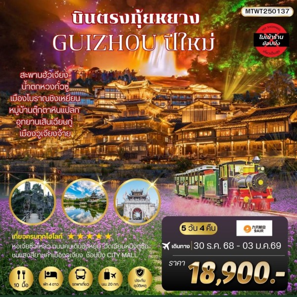 เมืองกุ้ยหยาง - ถนนคนเดินชิงหยุน - ปราสาทหินเย่หลางกู่ - เมืองโบราณชิงเหยียน - น้ำตกหวงกั่วซู่ - ชมการแสดงแสงสีเสียง - อุทยานหุบเขาบ่อน้ำเทวดา - Option เสริม! สะพานกระจก - หมู่บ้านโบราณวูเจียงจ้าย - สวนซากุระผิงป้า (รวมรถอุทยาน) - พิพิธภัณฑ์วัฒนธรรมเหล้าจีน – หอเจี่ยเซี่ยวโหลว - ช็อปปิ้ง City Mall