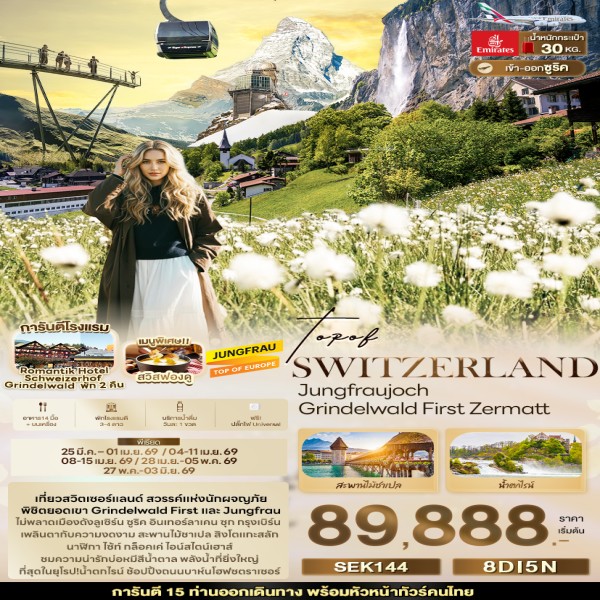 ประเทศสวิตเซอร์แลนด์ – เมืองชาฟฟ์เฮาเซิน – ชมน้ำตกไรน์ – เมืองลูเซิร์น - เมืองลูเซิร์น – กรินเดลวัลด์ – ขึ้นลงกระเช้าไอเกอร์ เอ็กเพรส - สถานีรถไฟจุงเฟรายอร์ค – เมืองเลาเทอร์บรุนเนิน – น้ำตกชเตาบ์บาค – กรินเดลวัลด์ - กรินเดลวัลด์ – บาห์นฮอฟ กรินเดลวาลด์ – ยอดเขา กรินเดลวาลด์ เฟียส - เมืองอินเตอร์ลาเคน – Kirchhoffer – กรินเดิลวัลท์ - กรินเดลวัลด์ - เมืองทาซ – นั่งรถไฟจากทาซสู่หมู่บ้านเซอร์แมท - ชมวิวยอดเขาแมทเทอร์ฮอร์น - นั่งรถไฟสู่เมืองทาช – เมืองทาซ – มองเทรอซ์ – เมืองเวเว่ย์ – รูปปั้นชาร์ลี แชปลิน – ส้อมยักษ์ – กรุงเบิร์น – นาฬิกา ไซ้ท์ กล็อคเค่ – บ่อหมีสีน้ำตาล – เมืองซูริค – โบสถ์ฟรอมุนสเตอร์ – โบสถ์ Grossmünster – โบสถ์เซนต์ปีเตอร์