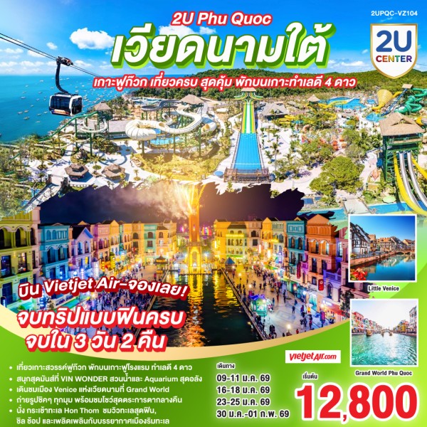 ประเทศเวียดนาม – ฟูก๊วก – นั่งกระเช้าสู่ Sun World Hon Thom +Aquatopia Water Park + Exotica Village - ชายหาด Hon Thom - Sun Set Town – สะพานจูบ - ถนนคนเดิน VUI-Fest Bazaar - เที่ยวสวนสนุก Vin wonders - Grand World Food Street เมืองที่ไม่เคยหลับใหล - ศาลเจ้าดิงเกา